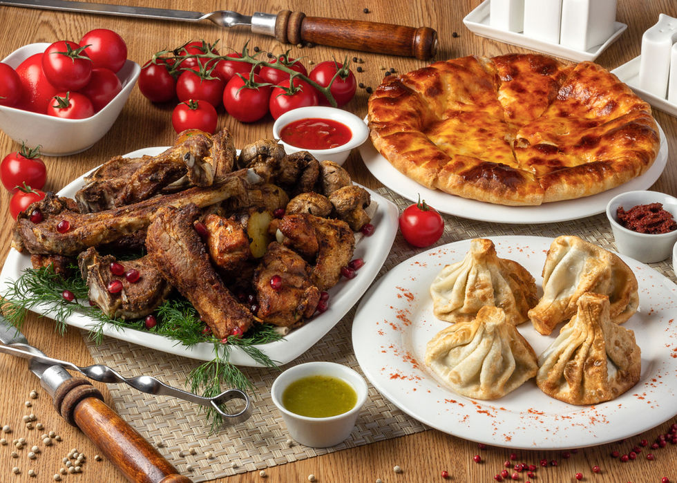 Говядина, лук, чеснок, помидоры, аджика, болгарский перец, хмели-сунели, уцхо-сунели, соль, перец.